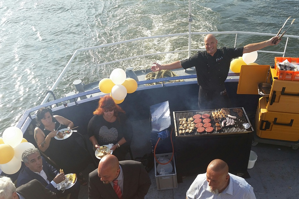 Na een mooie vaartocht door de Zaanstreek, het havengebied en het IJ van Amsterdam, genoten de feestvierders van een heerlijke barbecue op het buitendek. 's Avonds gingen de voetjes van de vloer op de muziek van een dj. Met dit spetterende feest werd deze memorabele trouwdag op het water afgesloten.